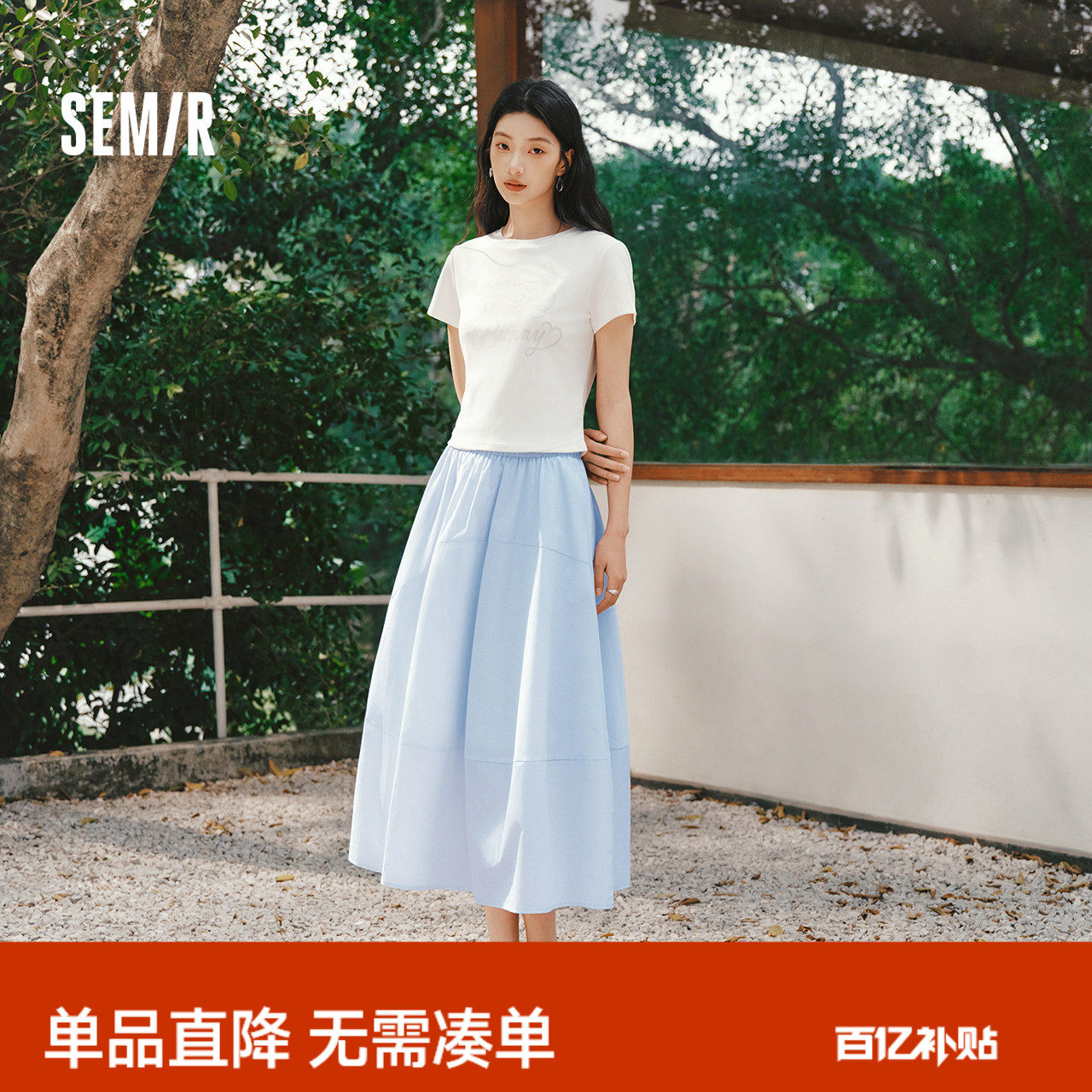 森马半身裙女夏A字白色纯色松紧腰长裙优雅百搭简约白月光蛋糕裙