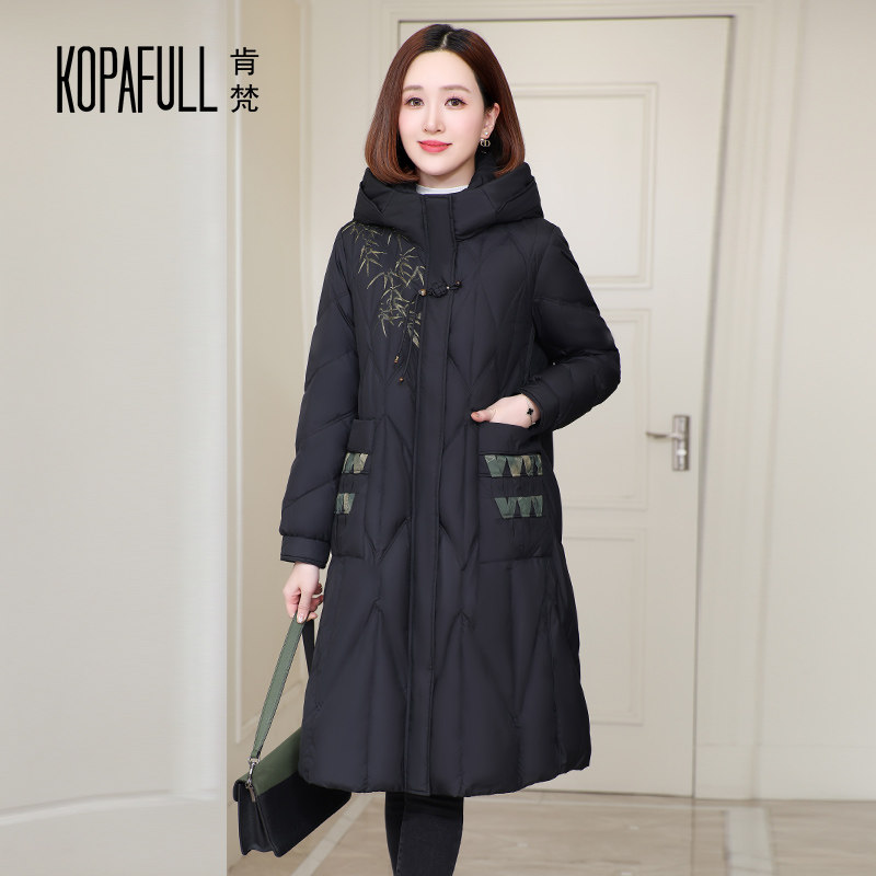 2025冬高端品牌加厚羽绒服女中长款大码连帽国风绣妈妈装鹅绒外套