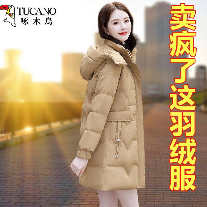 啄木鸟中年妈妈羽绒服女款冬季2025新款中长款宽松保暖白鸭绒外套