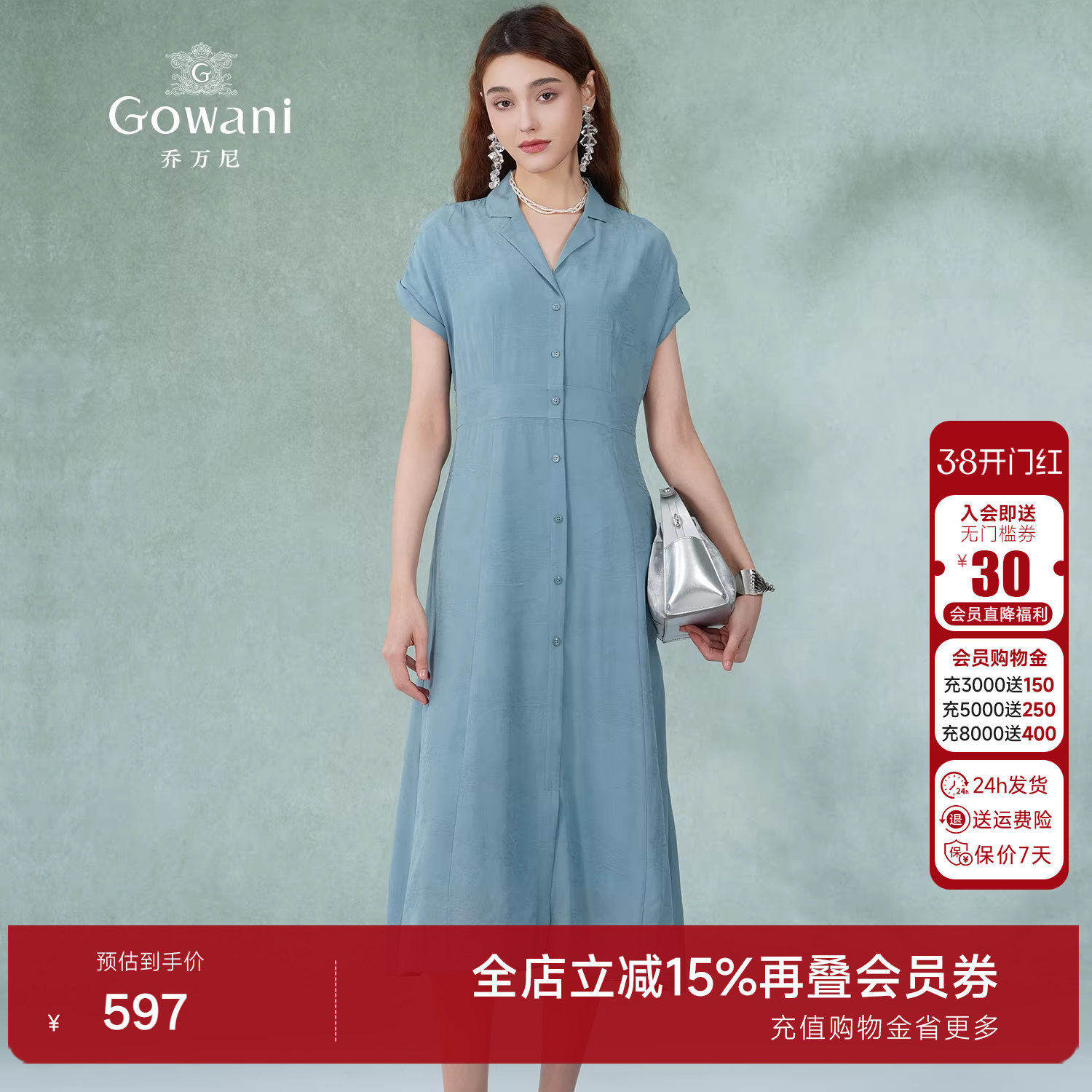 乔万尼商场夏季新品桑蚕丝连衣裙好看流行女雾霾蓝真丝裙ES2E188