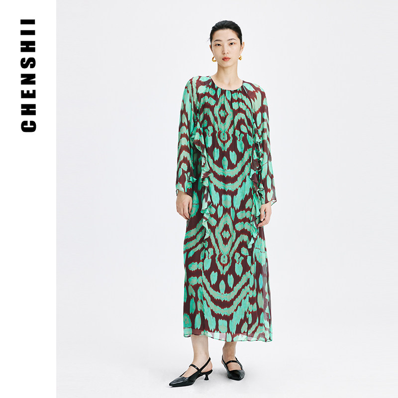 CHENSHII官方 2026夏季新款优雅设计感圆领荷叶边袖桑蚕丝连衣裙