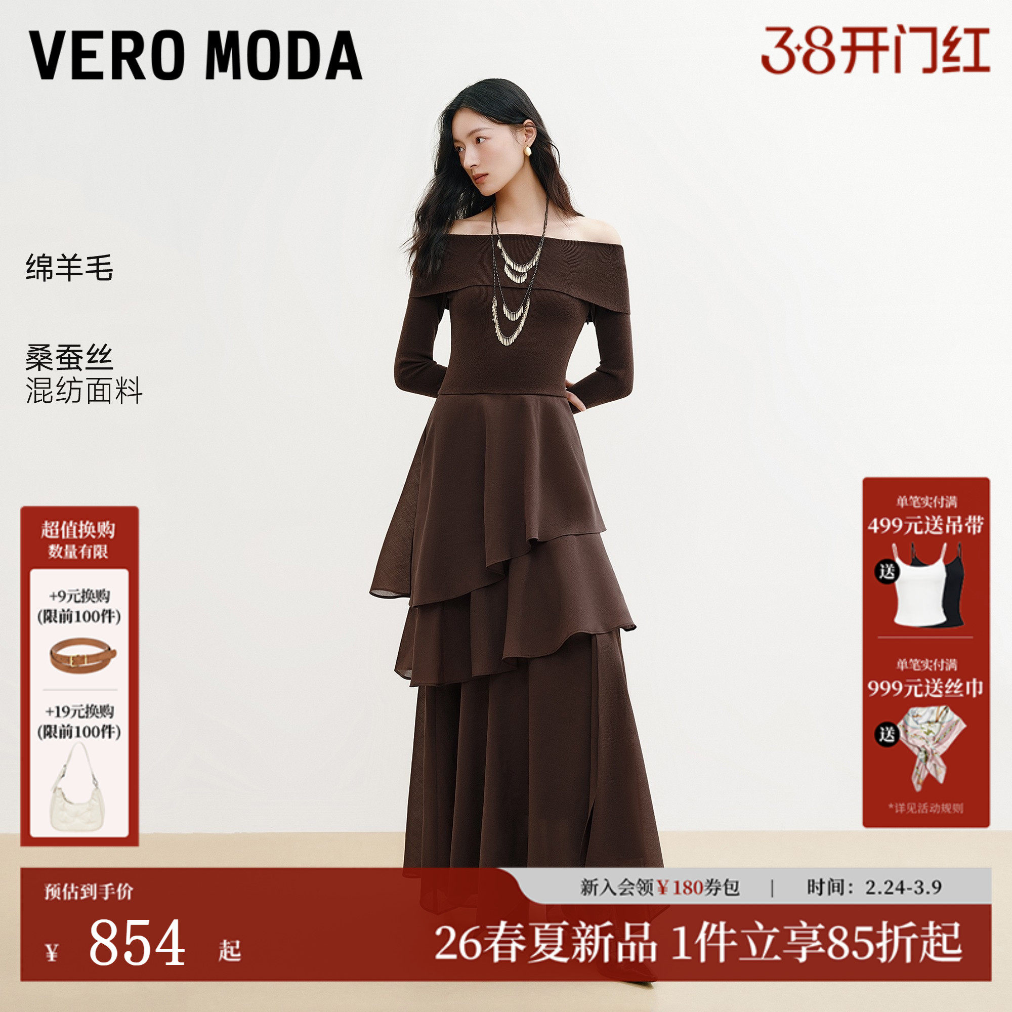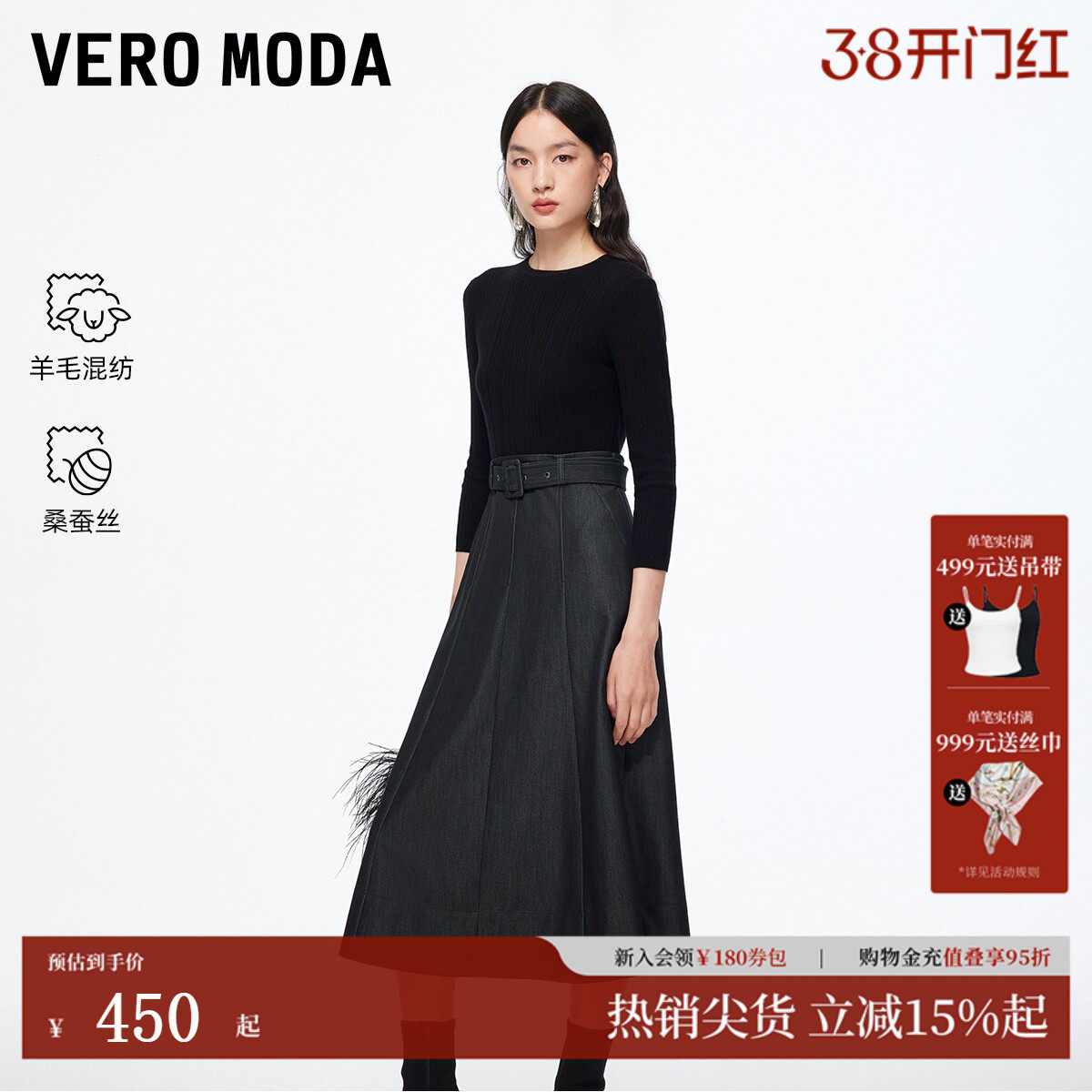 Vero Moda连衣裙女2026春新款含绵羊毛桑蚕丝收腰礼服裙32617D005