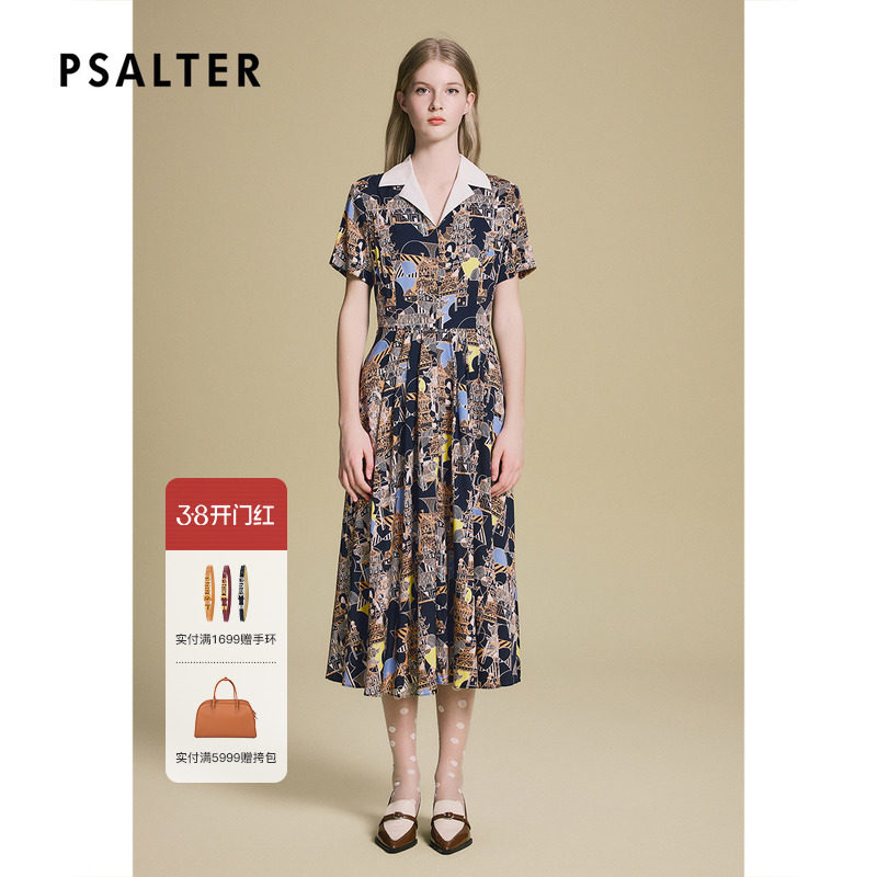 诗篇专选时尚撞色翻领几何碎花收腰显瘦桑蚕丝连衣裙2025夏款