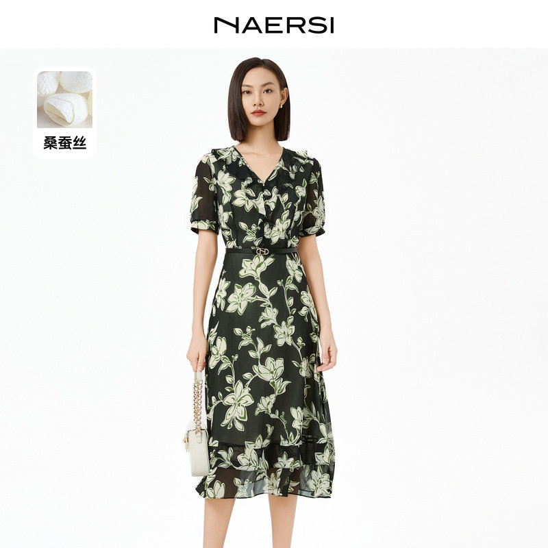 【南意雅旅】NAERSI娜尔思夏季气质优雅桑蚕丝连衣裙(配腰带)