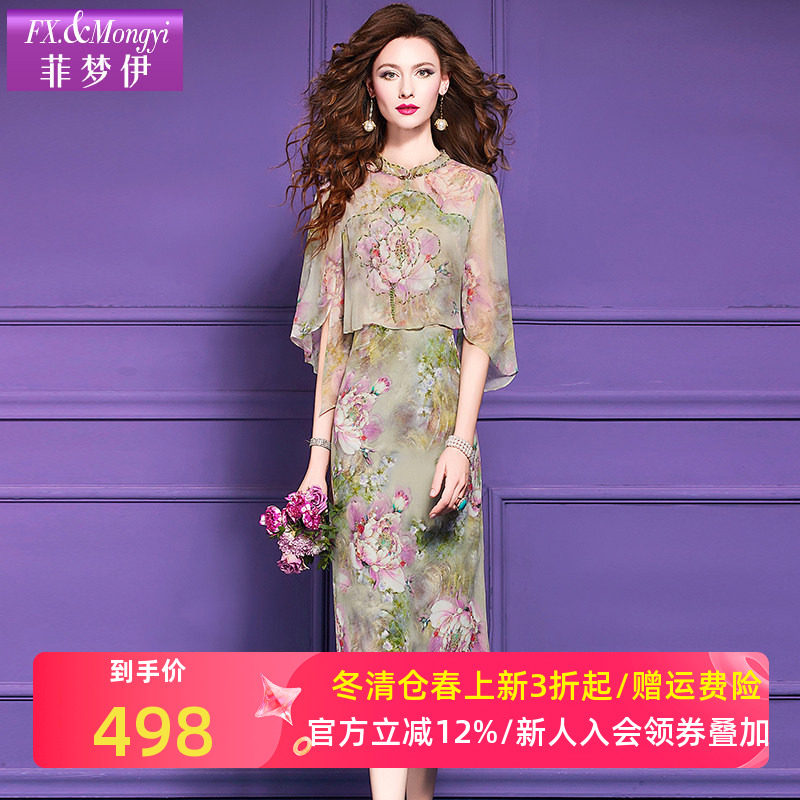 菲梦伊100桑蚕丝连衣裙女夏装新中式国风高端真丝钉珠印花长裙子