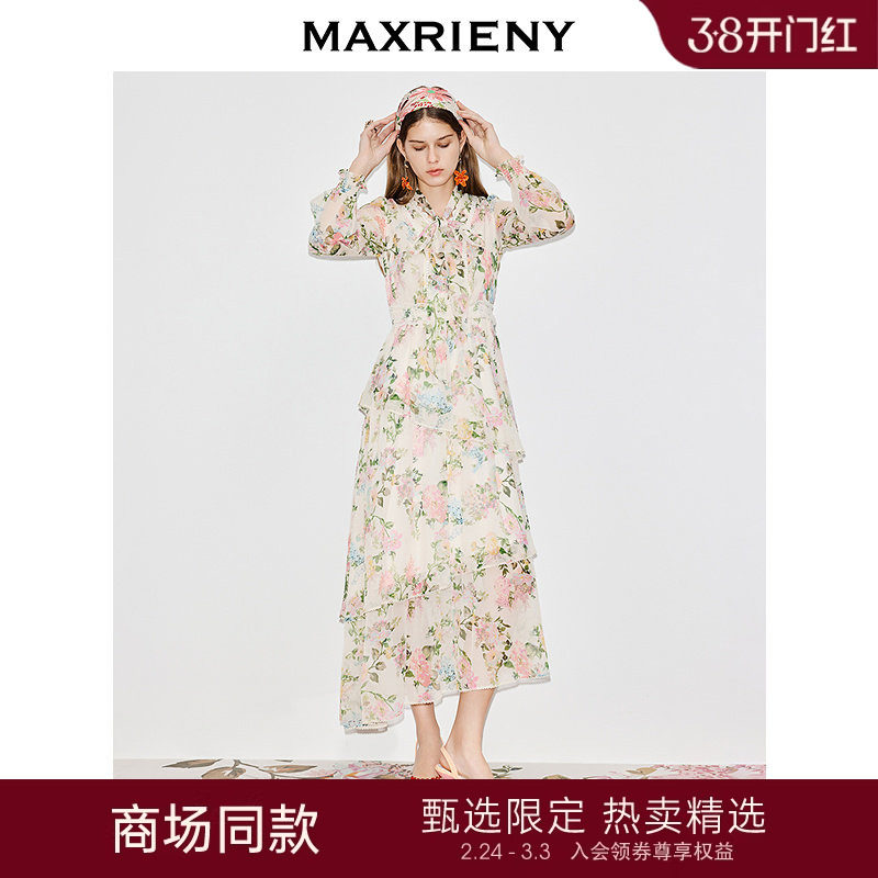 【商场同款】MAXRIENY桑蚕丝连衣裙2026春季新款V领收腰印花裙子