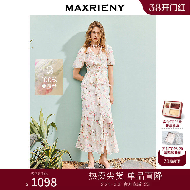 MAXRIENY桑蚕丝连衣裙度假风真丝碎花裙修身v领收腰抽褶茶歇裙夏