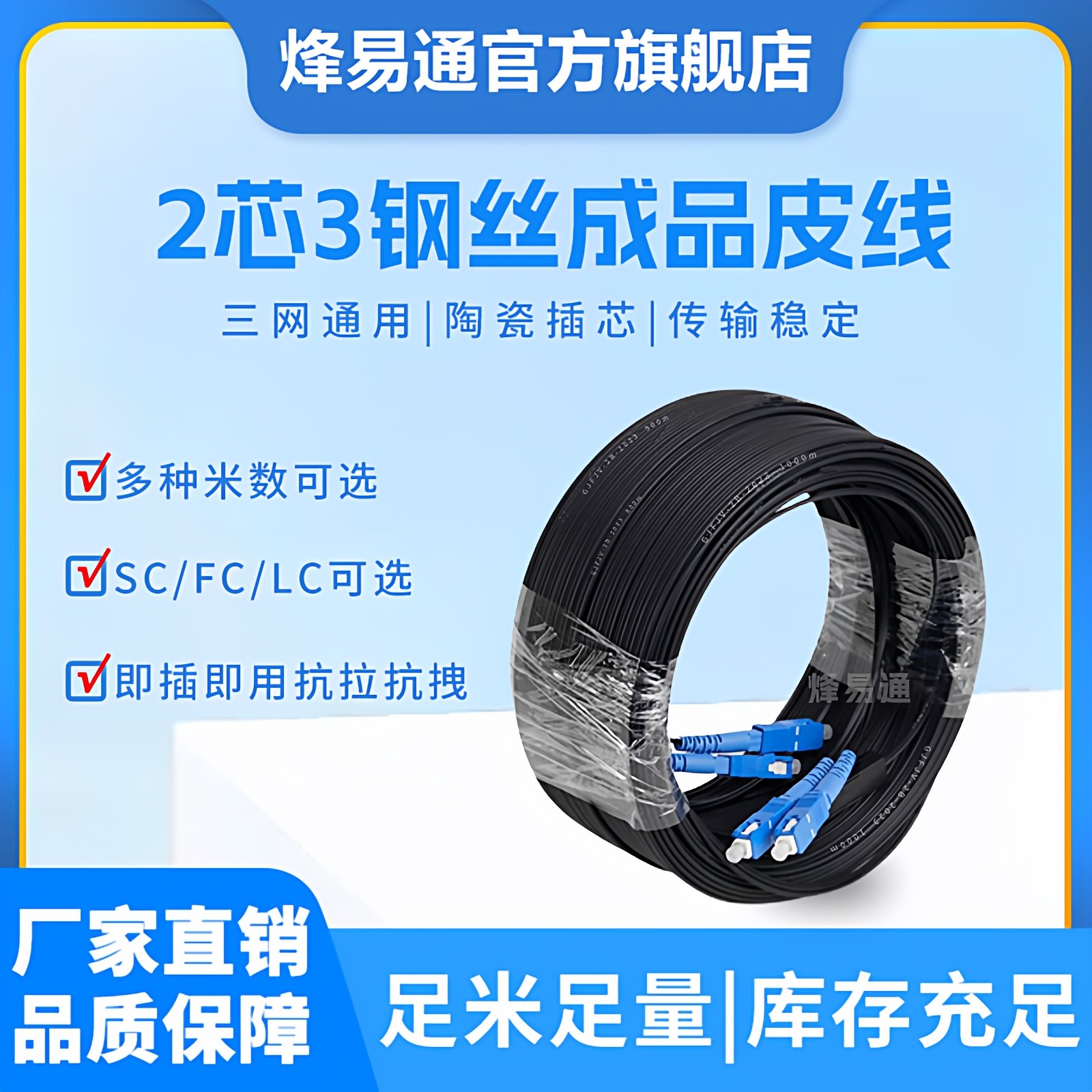 烽易通 成品光纤线 家用2芯4头皮线光纤电信级室外皮线光纤SC-SC/FC-FC2芯光缆 预成端 网络监控免熔接延长