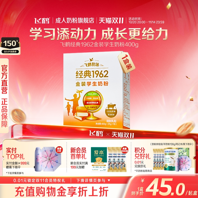 飞鹤经典1962金装儿童青少年学生牛奶粉400g高钙营养品早餐官方