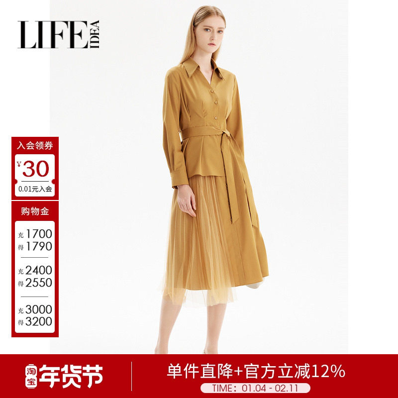 莱芙艾迪儿浪漫拼接长袖连衣裙收腰显瘦裙子束腰衬衫裙3V1L94105