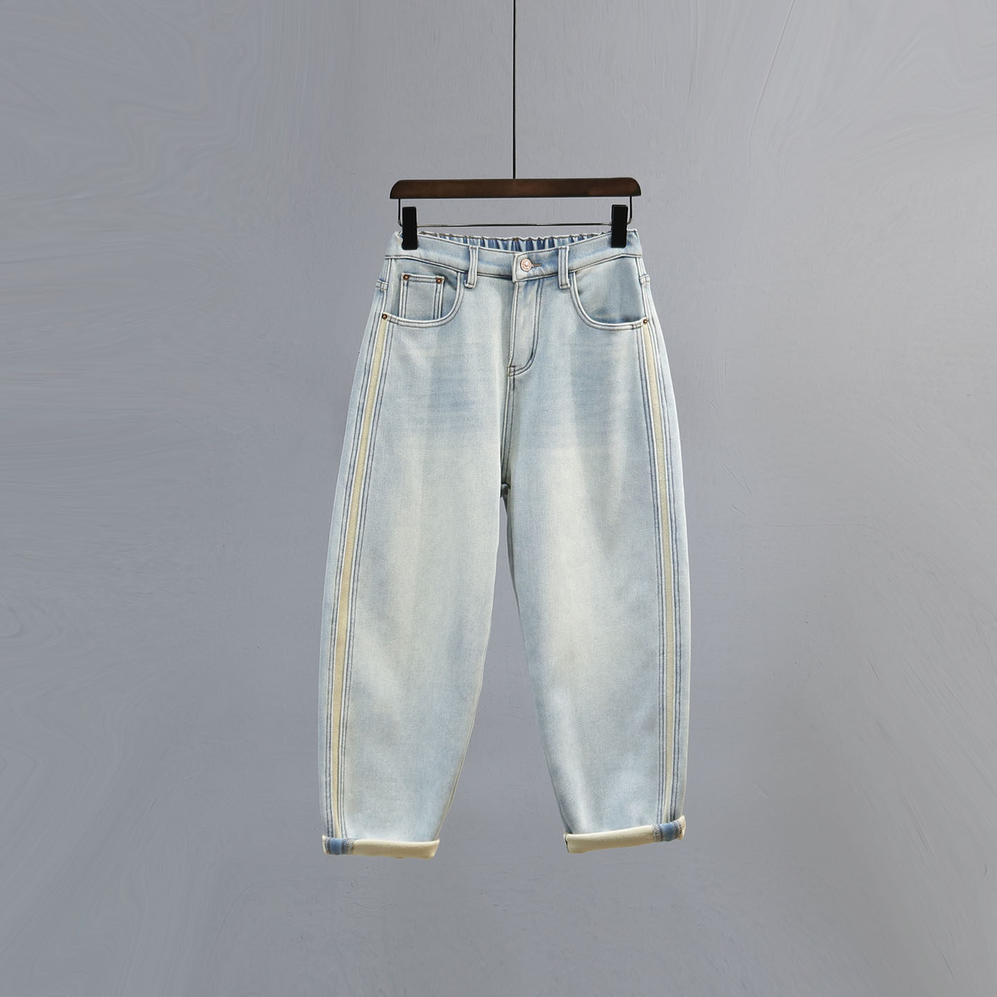冬季新款加绒加厚牛仔萝卜裤女浅蓝色高腰显瘦哈伦老爹裤休闲垮裤