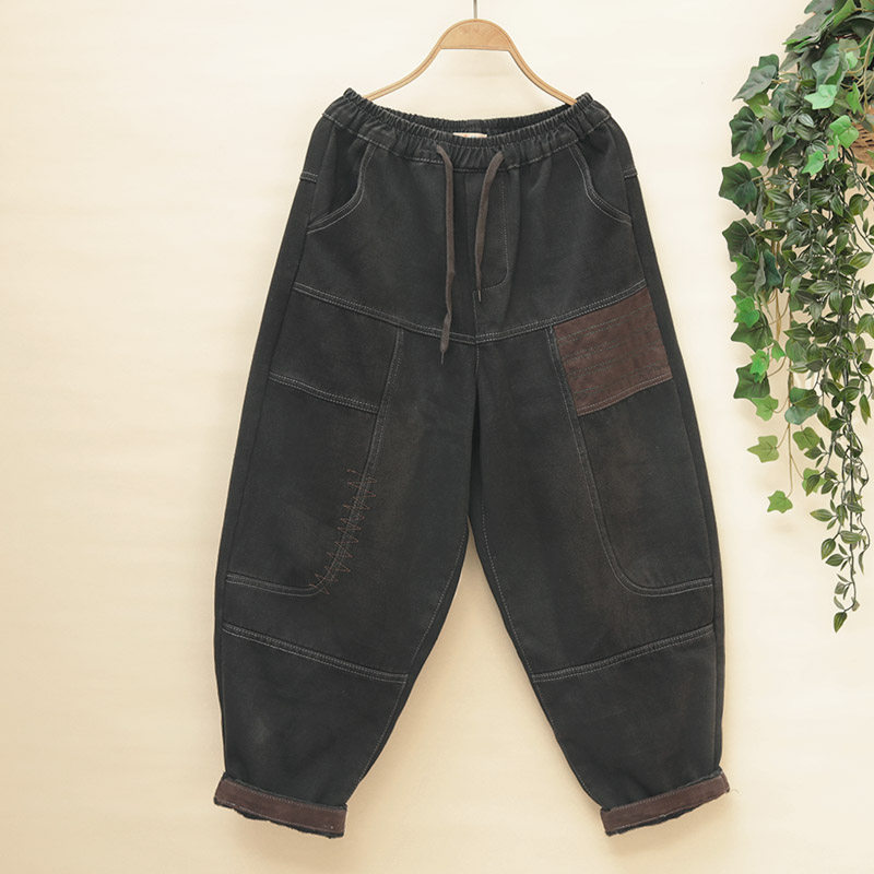 牛仔裤女中古风冬款加绒加厚哈伦垮裤撞色拼接大版显瘦洋气锥形裤