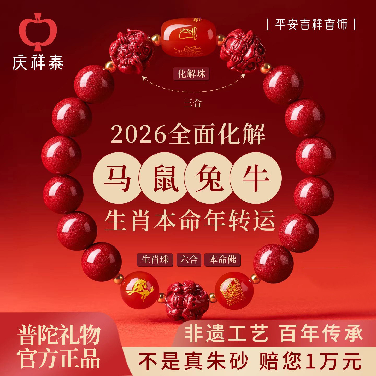 庆祥泰朱砂手串正品官方旗舰店女款2026属马本命年三合六合男手链
