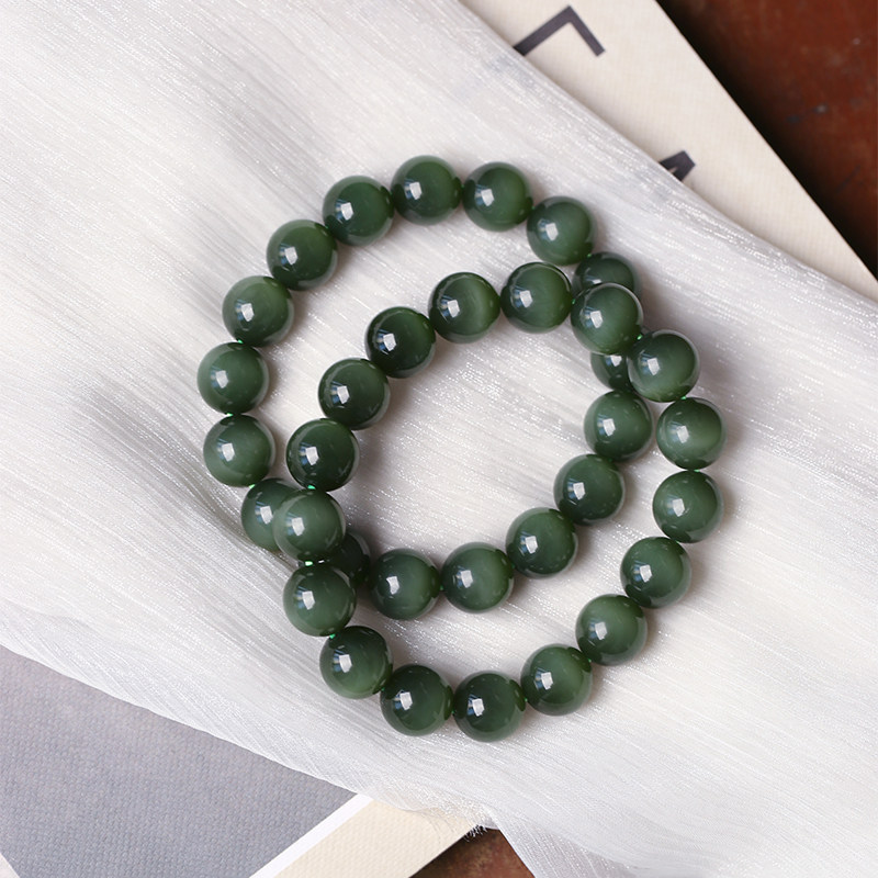 天然俄罗斯碧玉老料墨绿色猫眼料圆珠手链 男女碧玉手串饰品礼物