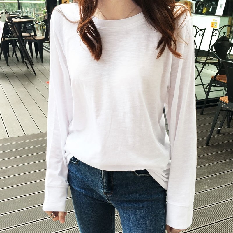 T187韩国女装新品2025宽松竹节棉薄款圆领长袖秋冬女T恤套头打底
