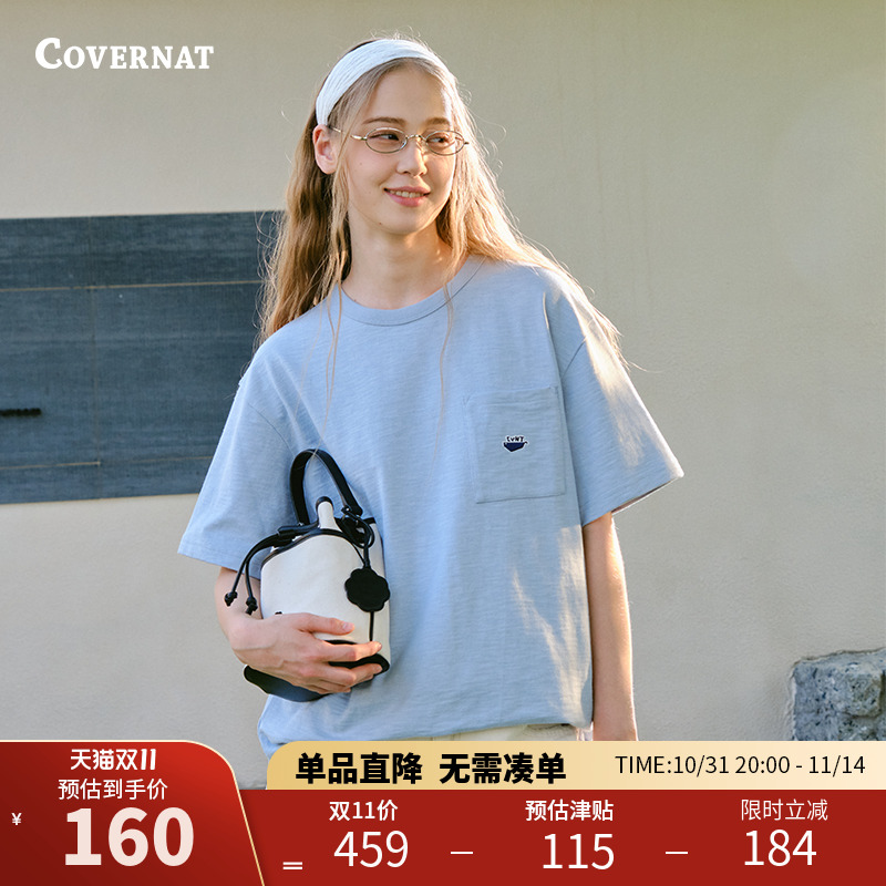 covernat韩国潮牌情侣款中性款竹节棉标志口袋T恤短袖男女圆领
