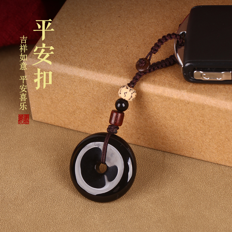 天然黑曜石平安扣吊坠女款项链钥匙扣挂件挂饰男士本命年礼物饰品