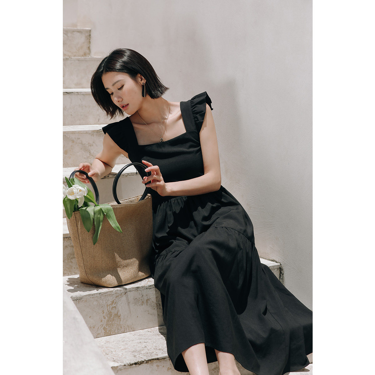 弥古黑色吊带连衣裙宽肩带法式度假背心裙女夏三亚沙滩裙海边裙子
