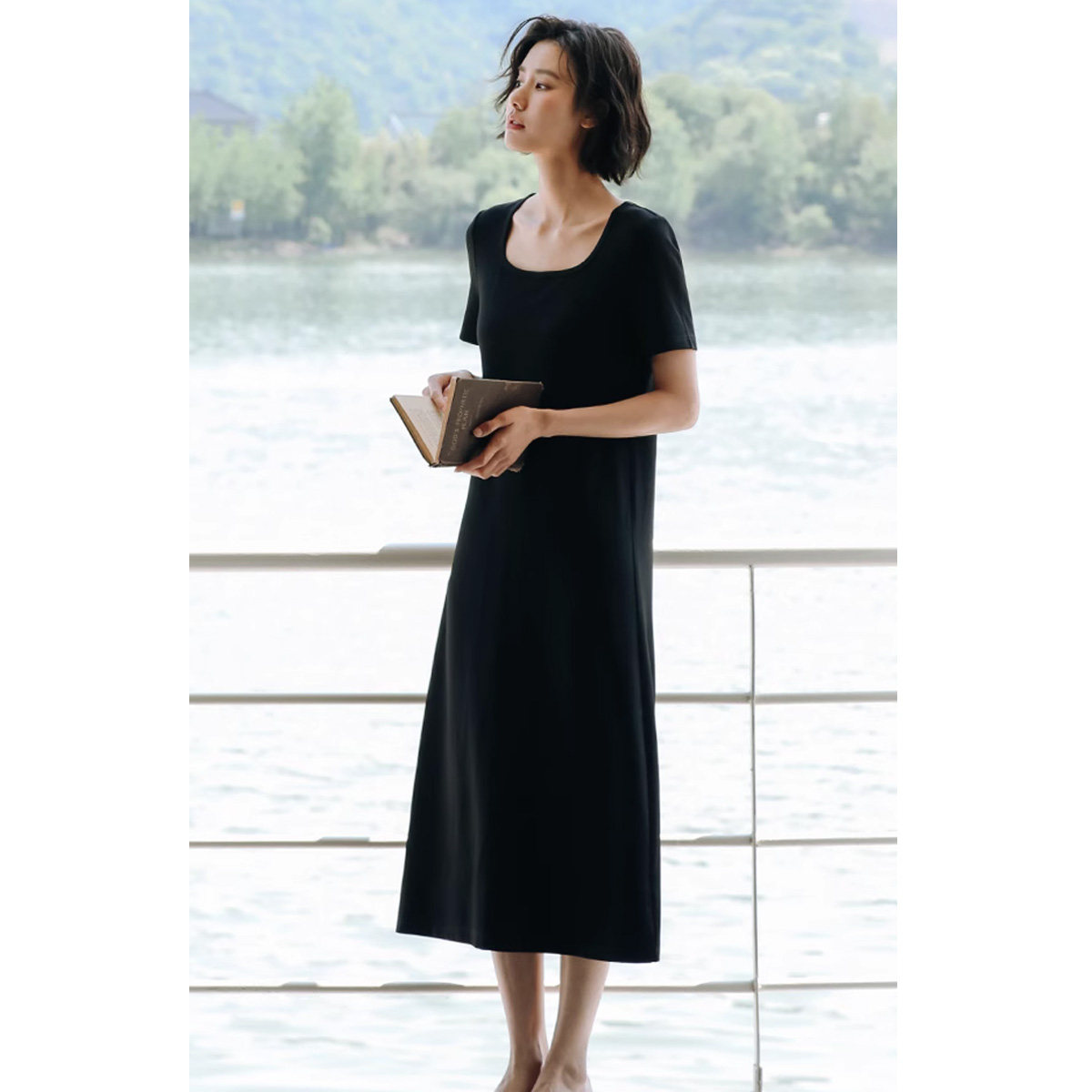 弥古黑色t恤连衣裙女显瘦针织小黑裙夏季三亚度假沙滩裙海边裙子