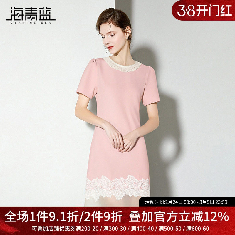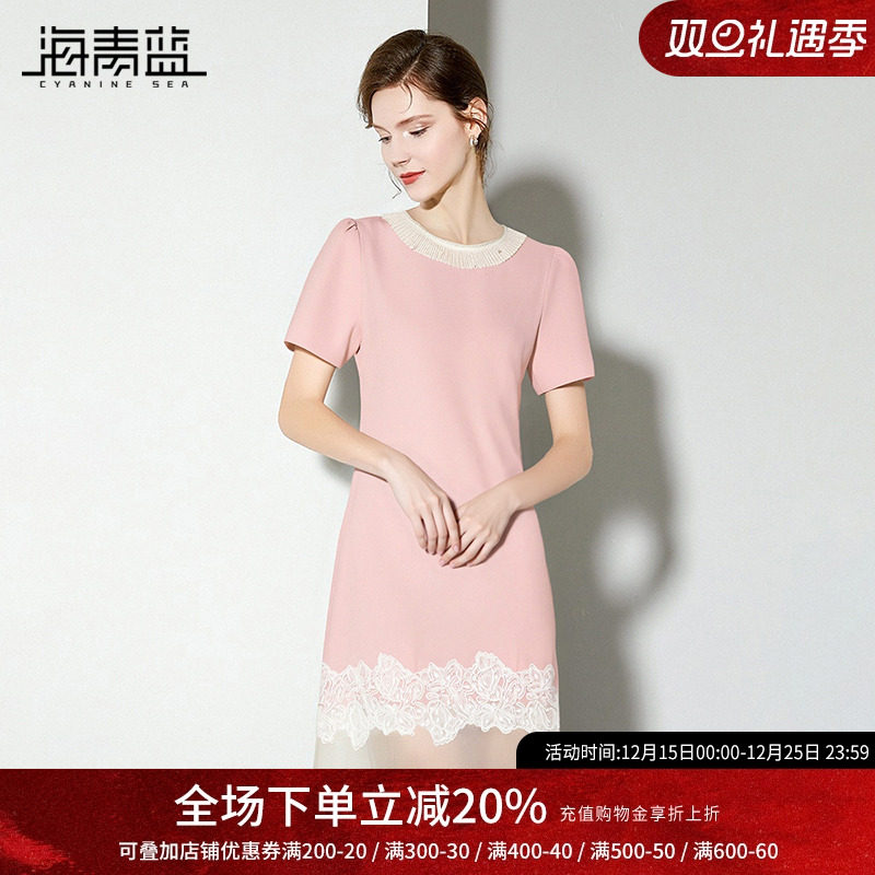 海青蓝 高端连衣裙夏女2025新款女装蕾丝拼接时尚气质度假海边裙