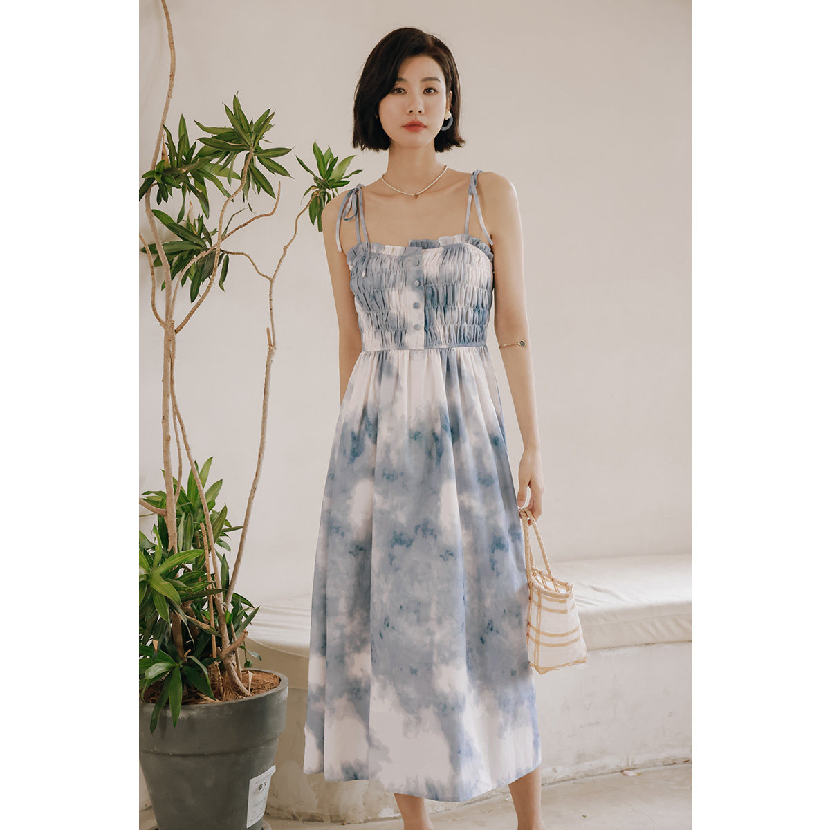 弥古水墨抹胸连衣裙高级感扎染吊带裙女夏三亚度假沙滩裙海边裙子