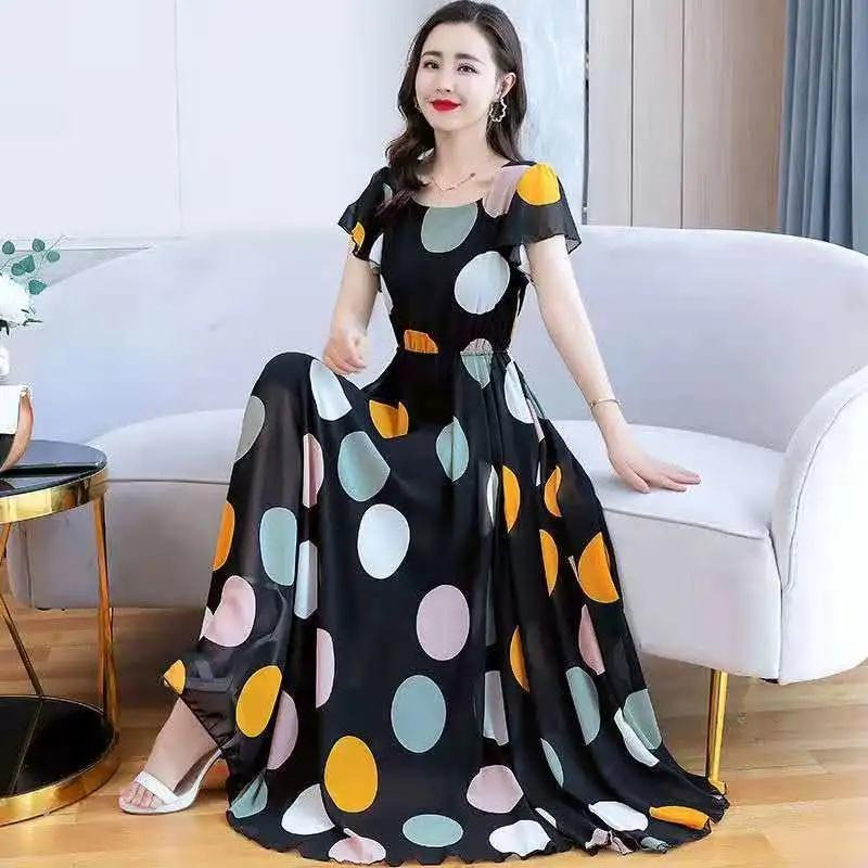 莎点荷叶边V领连衣裙雪纺大摆飘逸长裙海边裙子显瘦遮肉沙滩裙夏