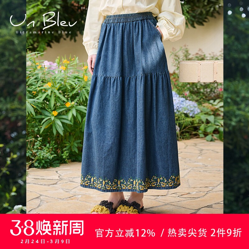 UnBleu牛仔裙女半身裙2026春季新款女装宽松休闲纯棉绣花海边裙子