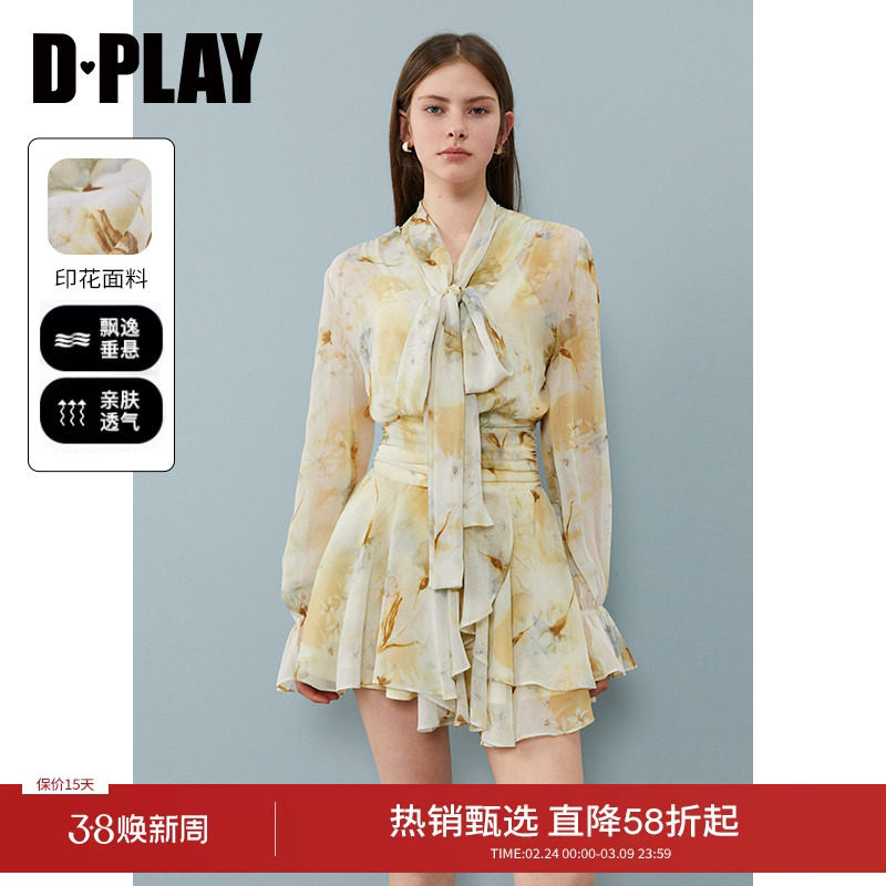 DPLAY黄色连衣裙收腰女长袖春季新款气质法式雪纺短款海边裙子