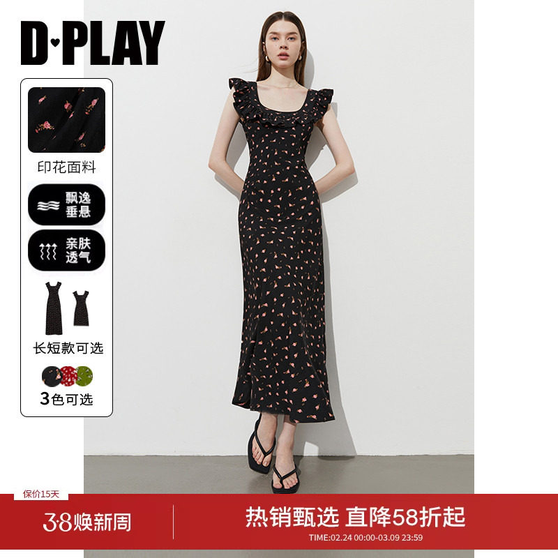 DPLAY新款黑色印花裙修身法式连衣裙沙滩海边裙子长裙女2026年夏