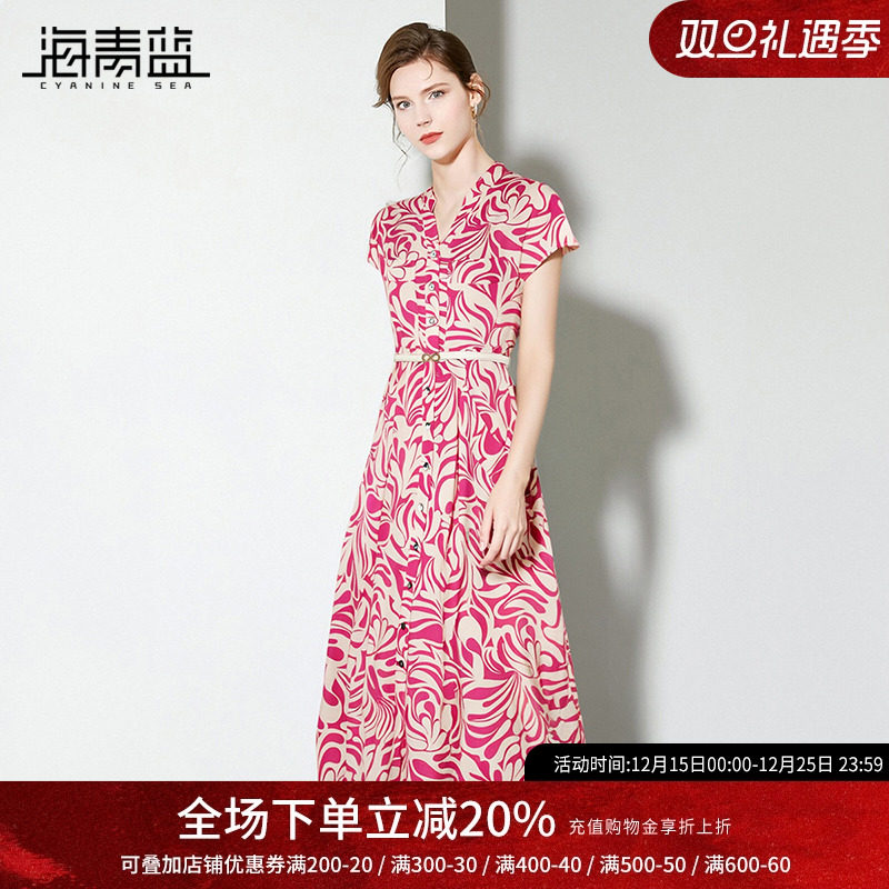 海青蓝 连衣裙夏女2025新款印花短袖立领女装高级设计海边裙子