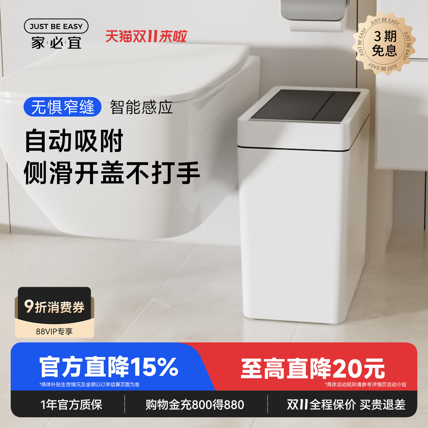 家必宜自动吸附感应式家用电动窄缝卫生间厨房客厅卧室智能垃圾桶