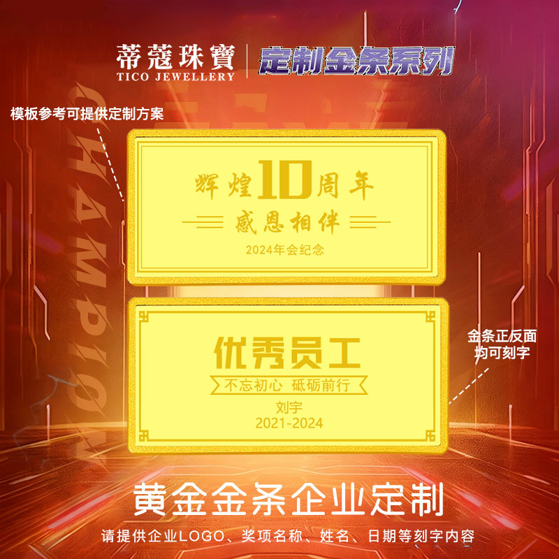 蒂蔻珠宝黄金金条足金9999企业定制水晶奖杯员工入职周年庆礼品