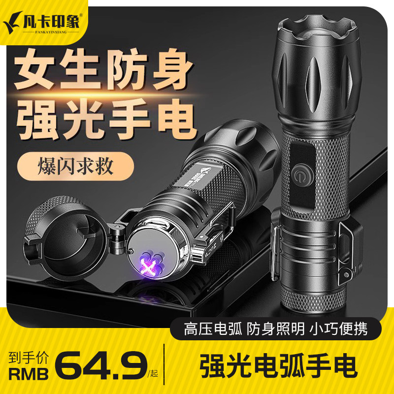 户外手电筒电弧点火防身手电筒强光爆闪SOS信号伸缩变焦充电电筒