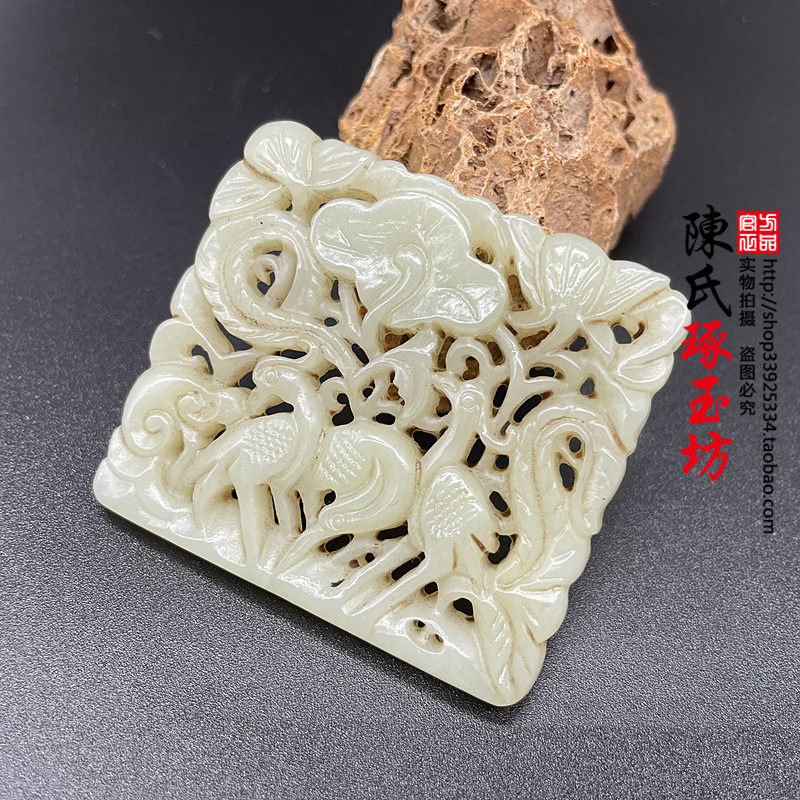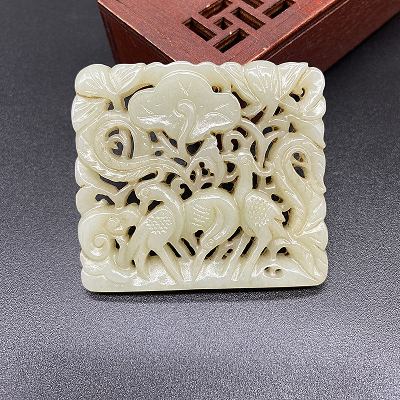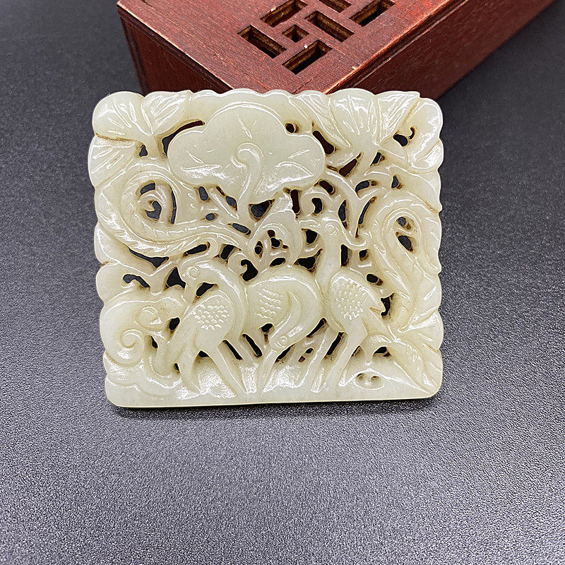 和田玉老玉镂空仙鹤戏莲吊坠挂件玉佩腰佩仿古做旧项坠挂坠颈饰品