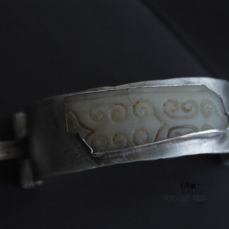 【骑单车的猫】原创设计和田老玉残片手工银复古镶嵌仿古宽手镯子