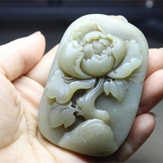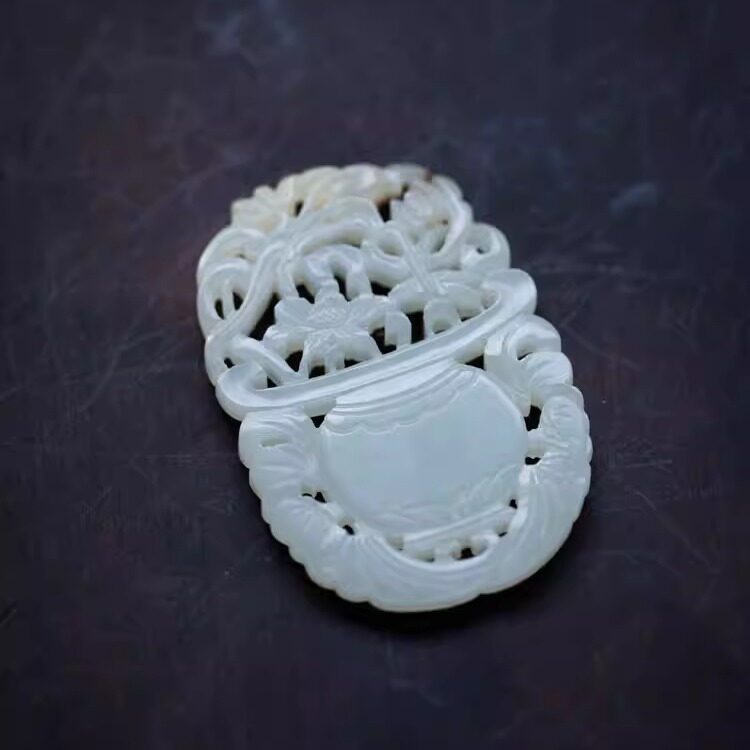 F722和田玉老玉佩古玩文玩花开富贵双面雕刻挂件手把件保真证书