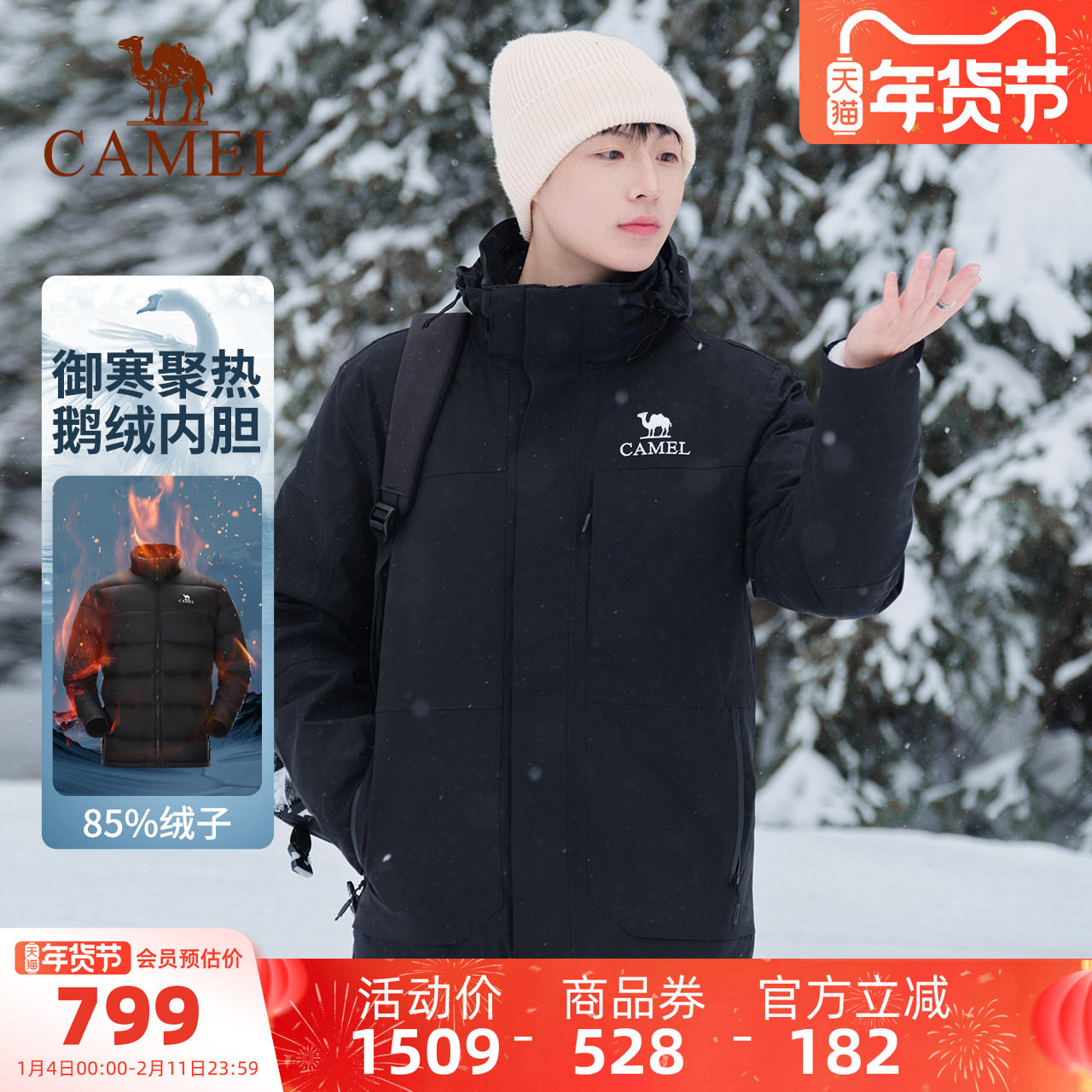 骆驼冲锋衣鹅绒内胆三合一加绒加厚羽绒服男户外防水外套滑雪服女