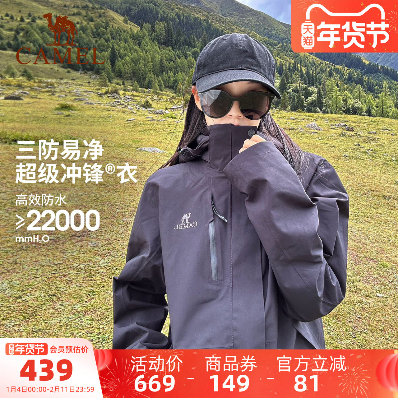 【羽绒内胆】骆驼户外黑色冲锋衣男羽绒服三合一防水外套滑雪服女