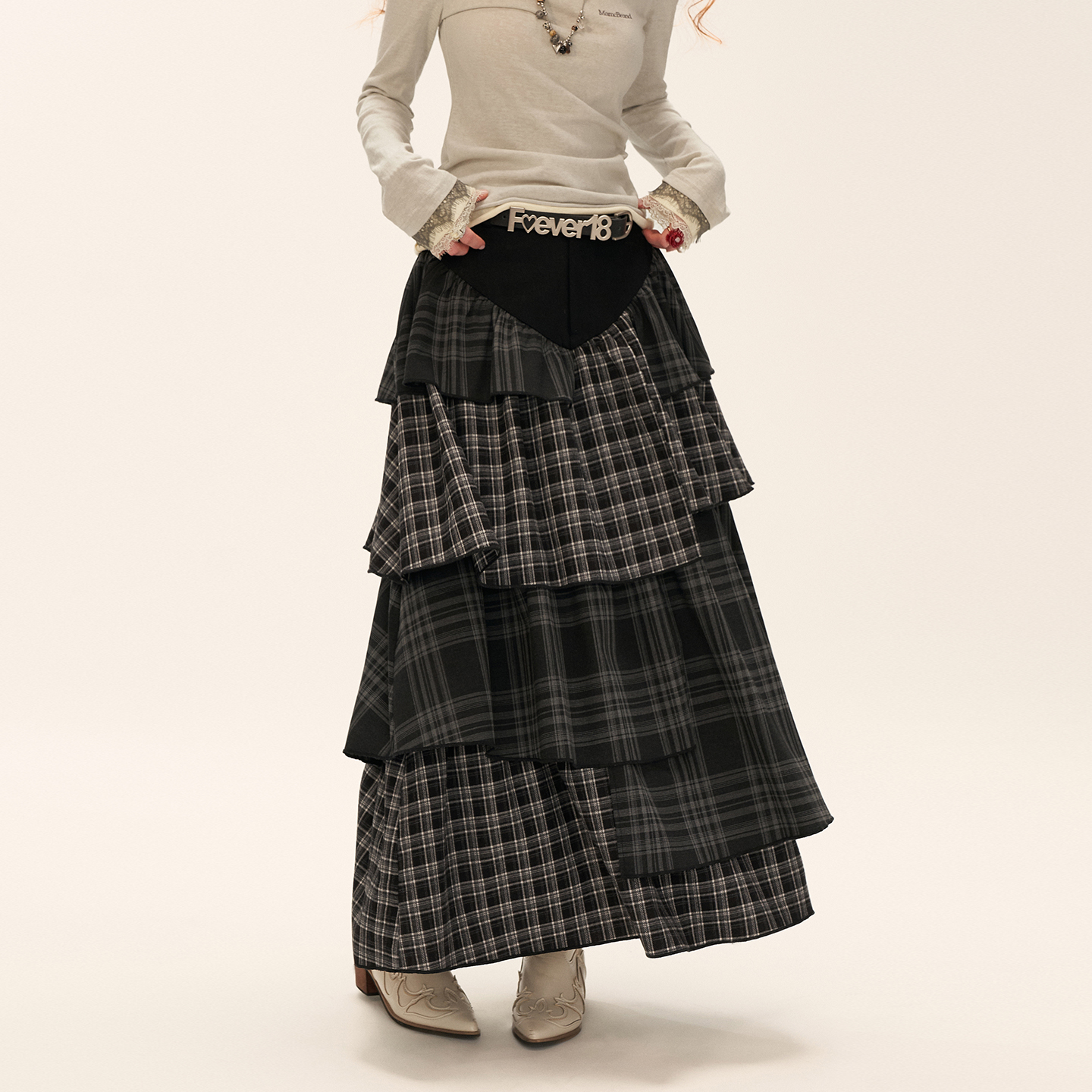 MAMC牛仔拼接格子层次感长裙秋冬新款黑色不规则复古休闲半身裙女
