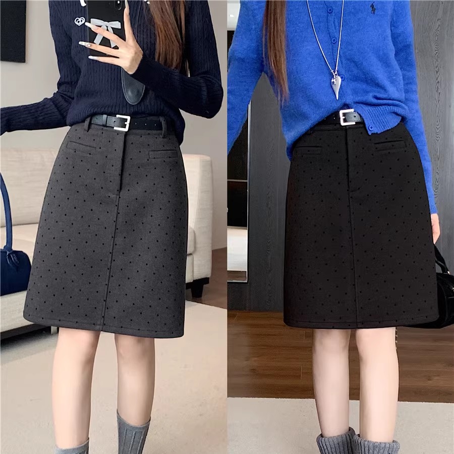 梨形身材大码高腰中长裙秋冬波点灰色毛呢半身裙显瘦a字包臀短裙