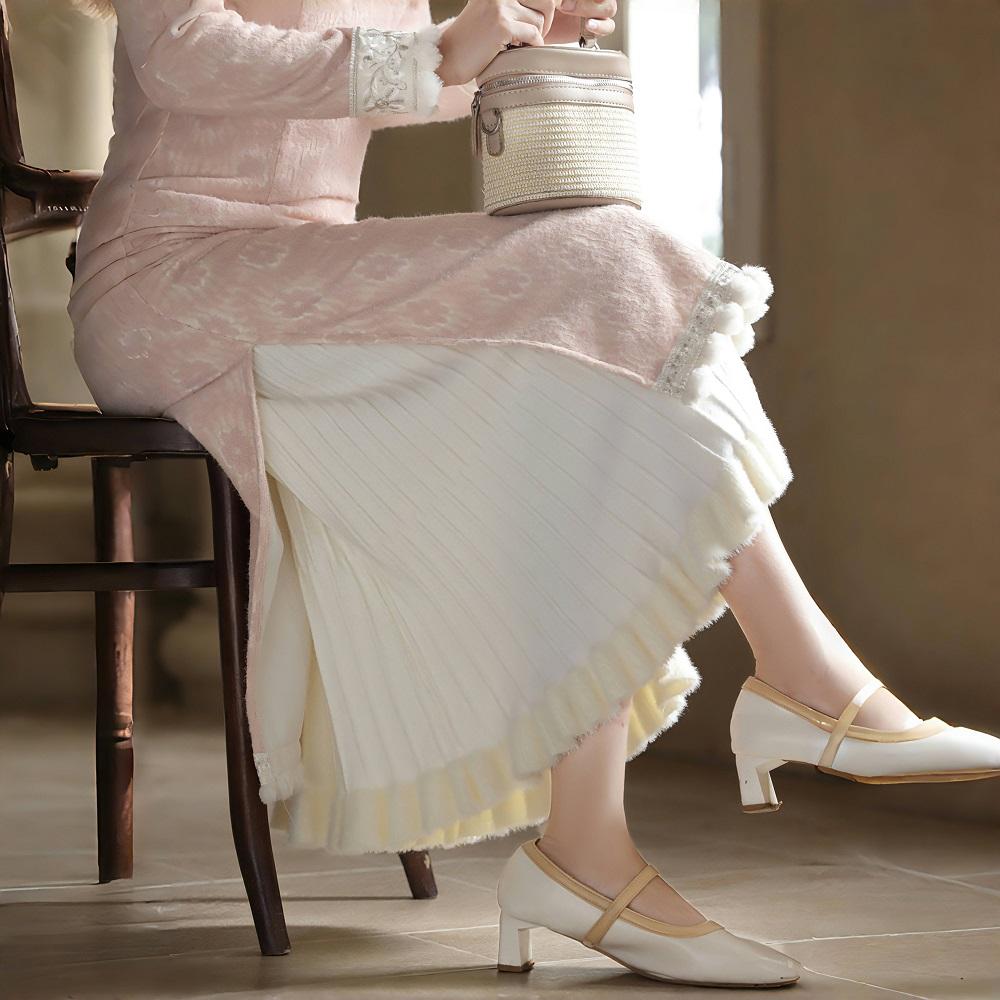 MISSCOCOON法式肌理感蕾丝连衣裙花边袖珍珠腰链白色长裙秋冬新款
