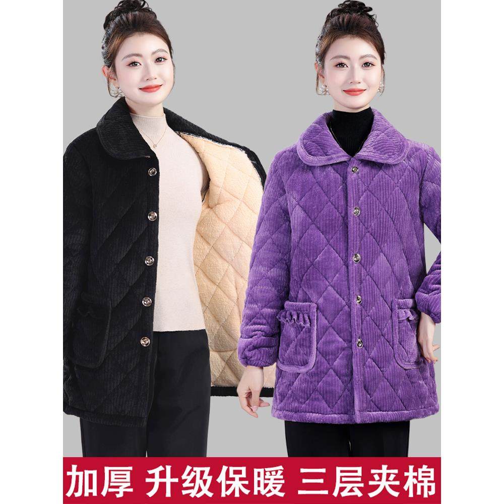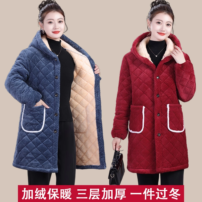 妈妈装加绒加厚棉衣女士中长款棉袄保暖三层夹棉外套冬季防寒罩衣