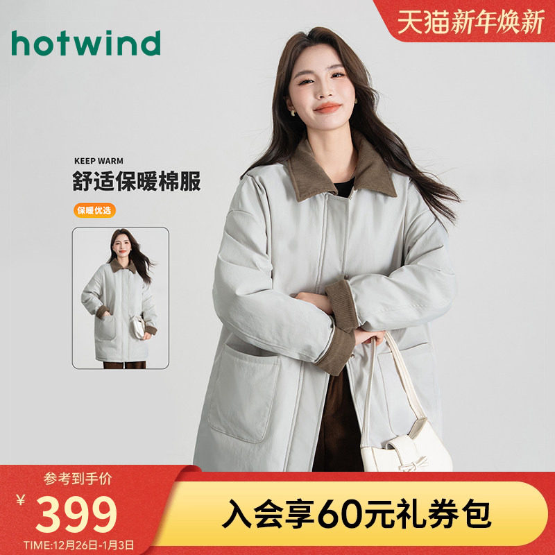 热风女士棉服复古巴恩风中长款拼色夹棉保暖棉衣外套秋冬翻领棉服