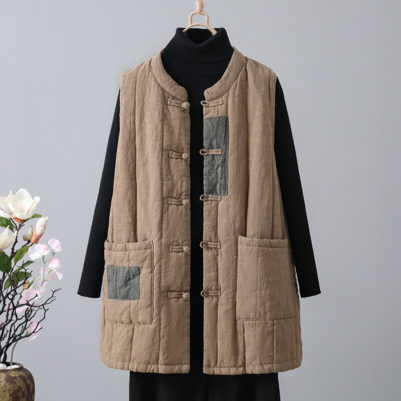 棉麻复古中长款女士马甲外套宽松中式盘扣亚麻夹棉加厚禅意马夹袍