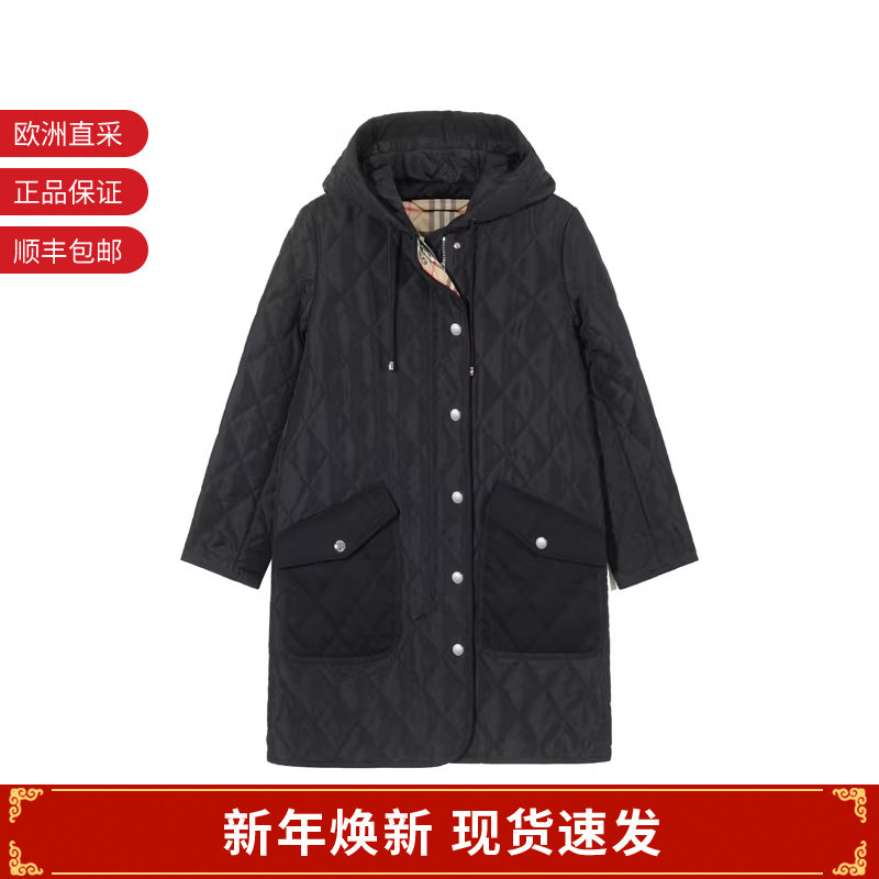 Burberry博柏利 女士中长款绗缝连帽大衣夹棉外套薄款棉服8096351