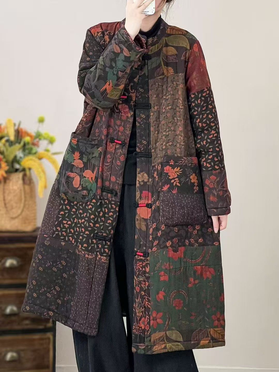 大码中长款盘扣秋冬民族风复古风印花棉服女新款女士夹棉二棉外套