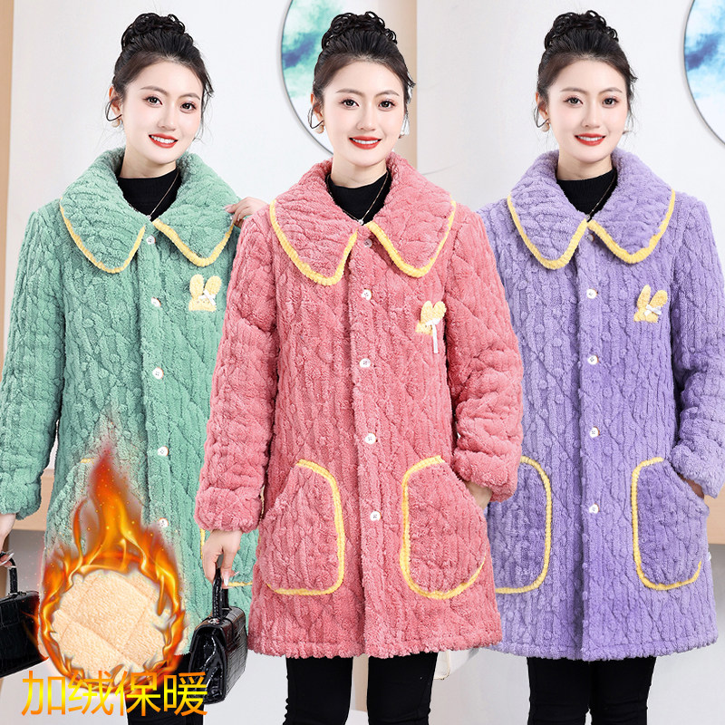 加绒加厚女士罩衣外套中长款冬季夹棉保暖工作服棉服法兰绒家居服