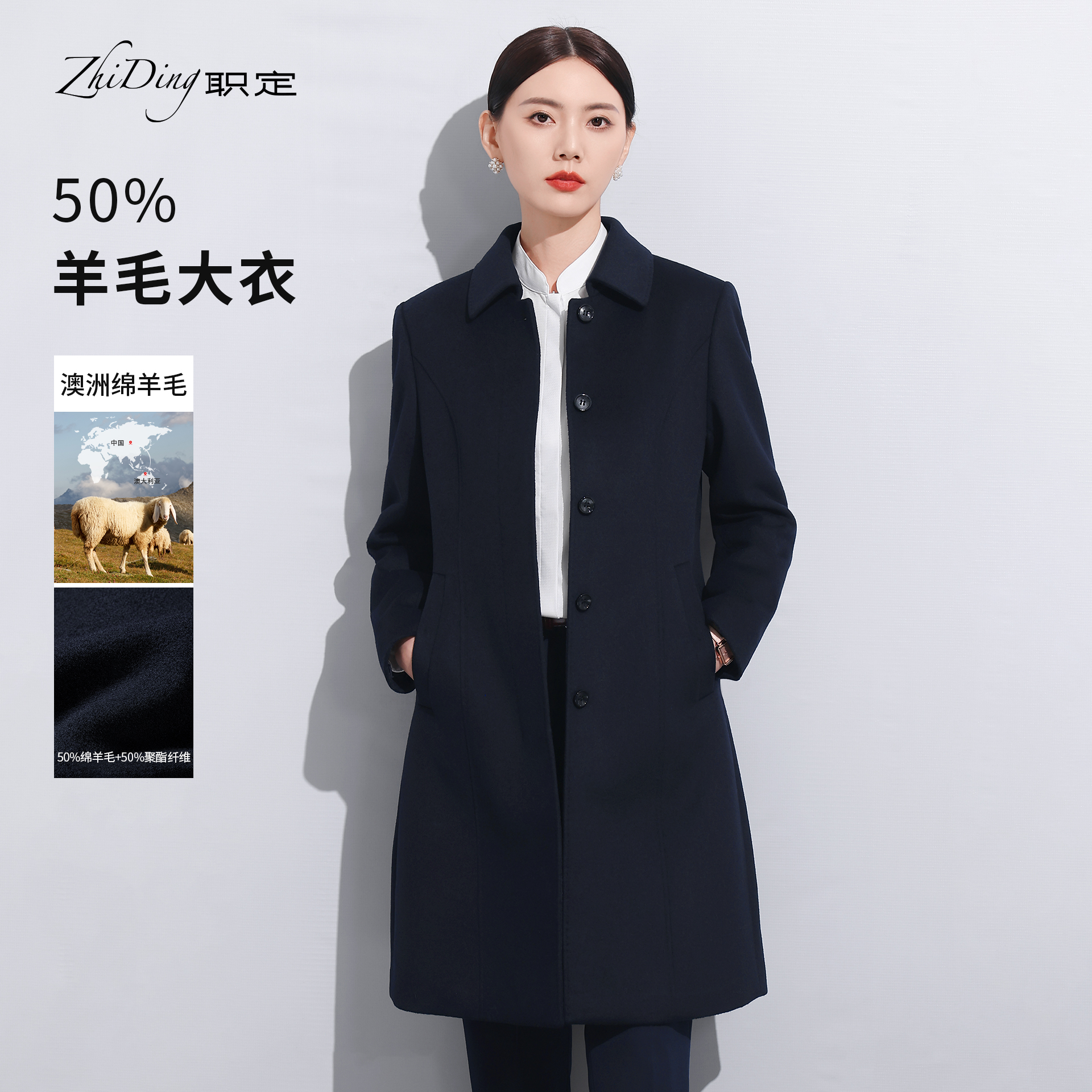 职定女士羊毛混纺翻领单排扣50%羊毛大衣宽松中长款气质通勤外套