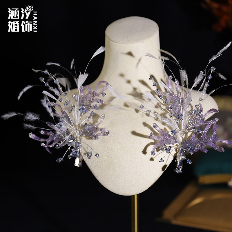 涵汐新款紫色造液花水晶串珠发饰羽毛发夹新娘高级主婚纱造型配饰