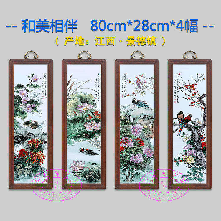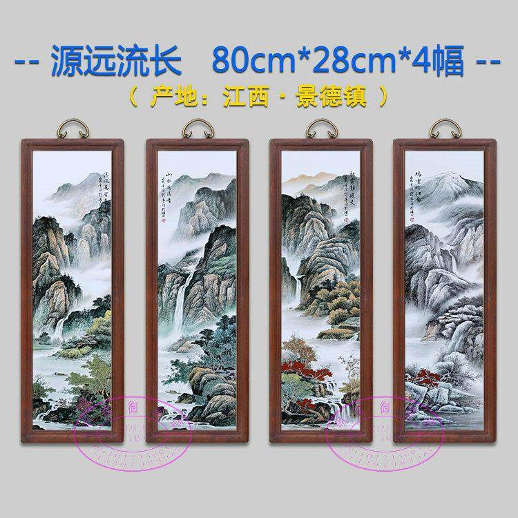 仿古实木框瓷板画景德镇陶瓷挂画手绘山水画中式客厅装饰画四条屏